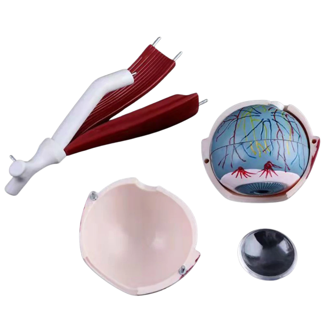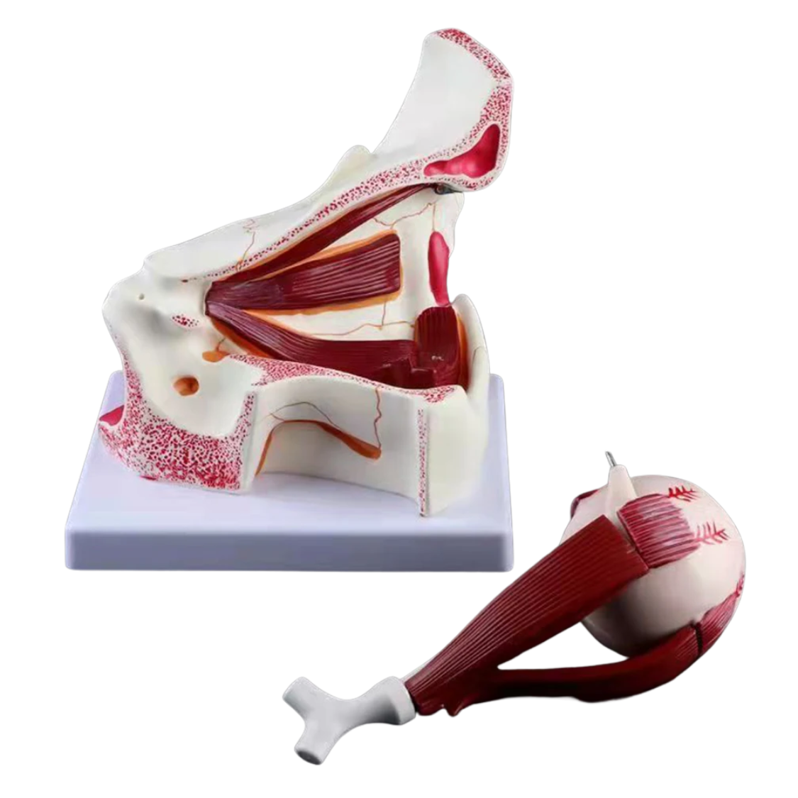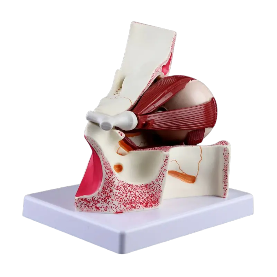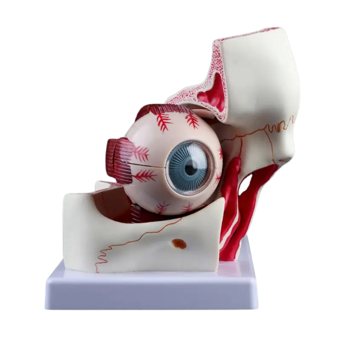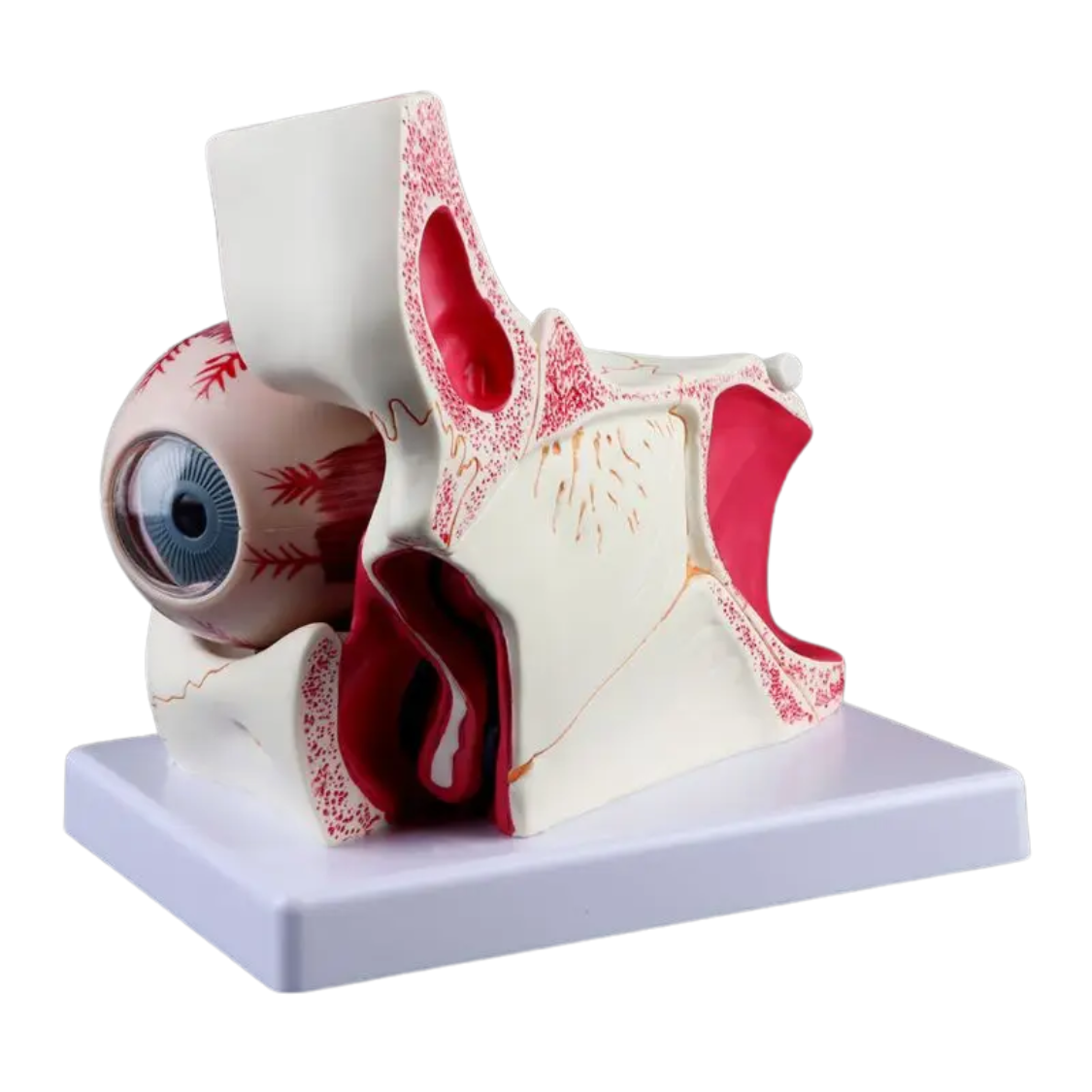 Das anatomische Augenmodell „Optima“ zeigt die Position des Auges und des Sehnervs in der Augenhöhle in präziser, dreifach vergrößerter Darstellung. Das Modell ist in 10 Einzelteile zerlegbar und ermöglicht so ein anschauliches Verständnis der inneren Strukturen wie Linse, Netzhaut, Hornhaut und umliegende anatomische Bereiche.